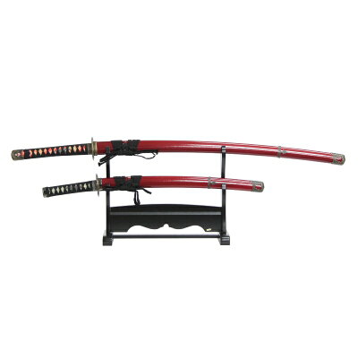 模造刀 幕末シリーズ 沖田 総司 掛け台・刀袋付 大小刀 刃紋入り刀身 メッキ合金[gst-nd3-3]日本刀 美術刀剣 おもちゃ 通販【代引き不可】沖田総司拵 大小刀(掛け台・刀袋付)◆台サイズ◆幅約40.5×奥行15×高さ31.7cm◆刀身サイズ◆大刀:全長約106×刃渡73×柄長25.5cm小刀:全長約70×刃渡45×柄長17.5cm◆刀身重さ◆大刀:総重量 約1195g(鞘を払って 約975g)小刀:総重量 約760g(鞘を払って 約565g)◆仕様◆刀身:並刀身鞘:朴の木柄:プラ製(金襴緞子下地)、金具:合金下緒:人絹 黒糸、柄糸:人絹 黒糸樋入刀身 加州藤原清光写し、小豆呂塗り鞘縁:草の図縁金具、頭:太刀用頭金具、目貫:竜図目貫猪目透かし鍔、半太刀用鐺金具美濃の国、関は鎌倉時代の昔から幾多の名匠が育った。