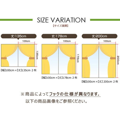 柄が選べる2枚組デザインカーテン 【素材】ポリエステル 100% 【付属品】共生地タッセル 2本、アジャスターフック 【サイズ】幅100cm×丈135cm 2枚組/丈178cm 2枚組/×丈200cm 2枚組