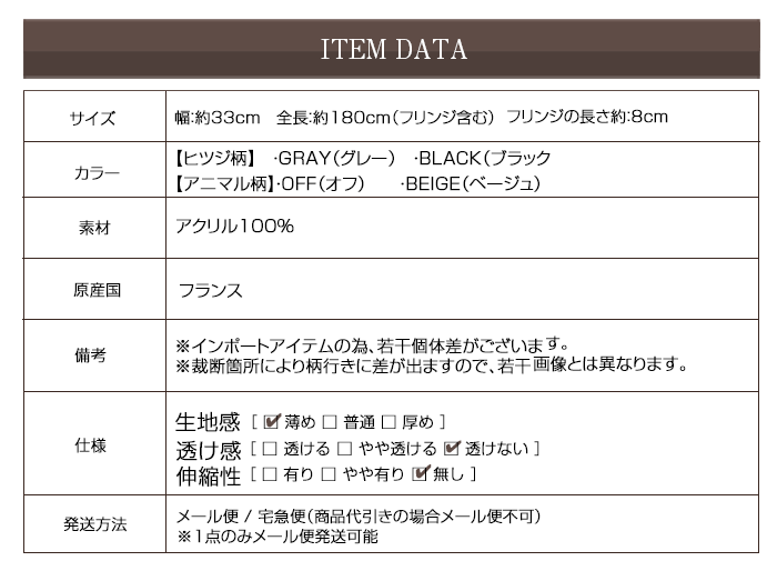 SPEC ブランド 【Pierre Quioc / ピエールキオック】 カラー 【シープ柄】 ・GRAY(グレー)・BLACK(ブラック) 【アニマル柄】・OFF(オフ)・BEIGE(ベージュ) 素材 アクリル100% サイズ ・幅30cm ・全長180cm(フリンジ含む) フリンジの長さ8cm ※フリンジは切りっぱなしになっております。